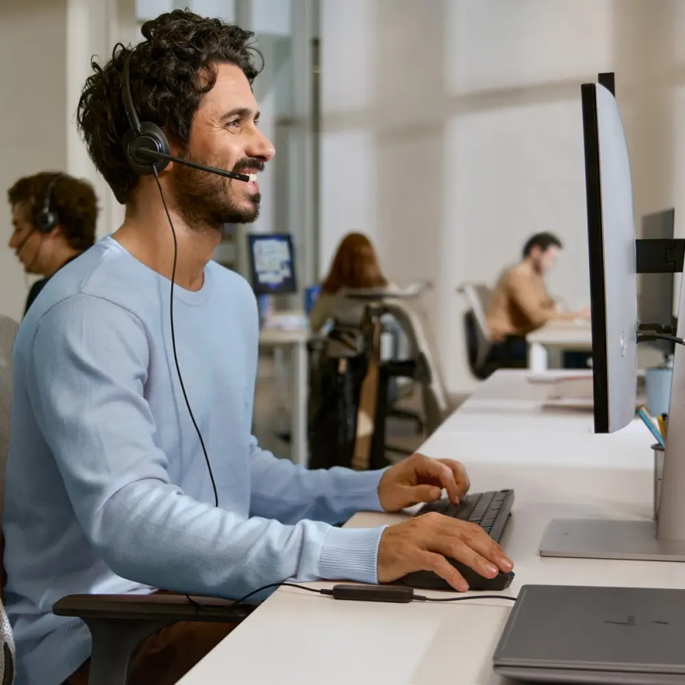 Pozostań w pełnym skupieniu dzięki zestawowi słuchawkowemu zaprojektowanemu z myślą o długich i wymagających dniach pracy. Lekkie materiały i miękkie poduszki nauszne zapewniają komfort podczas spotkań, dzięki czemu możesz koncentrować się na rozmowie – a nie na słuchawkach.